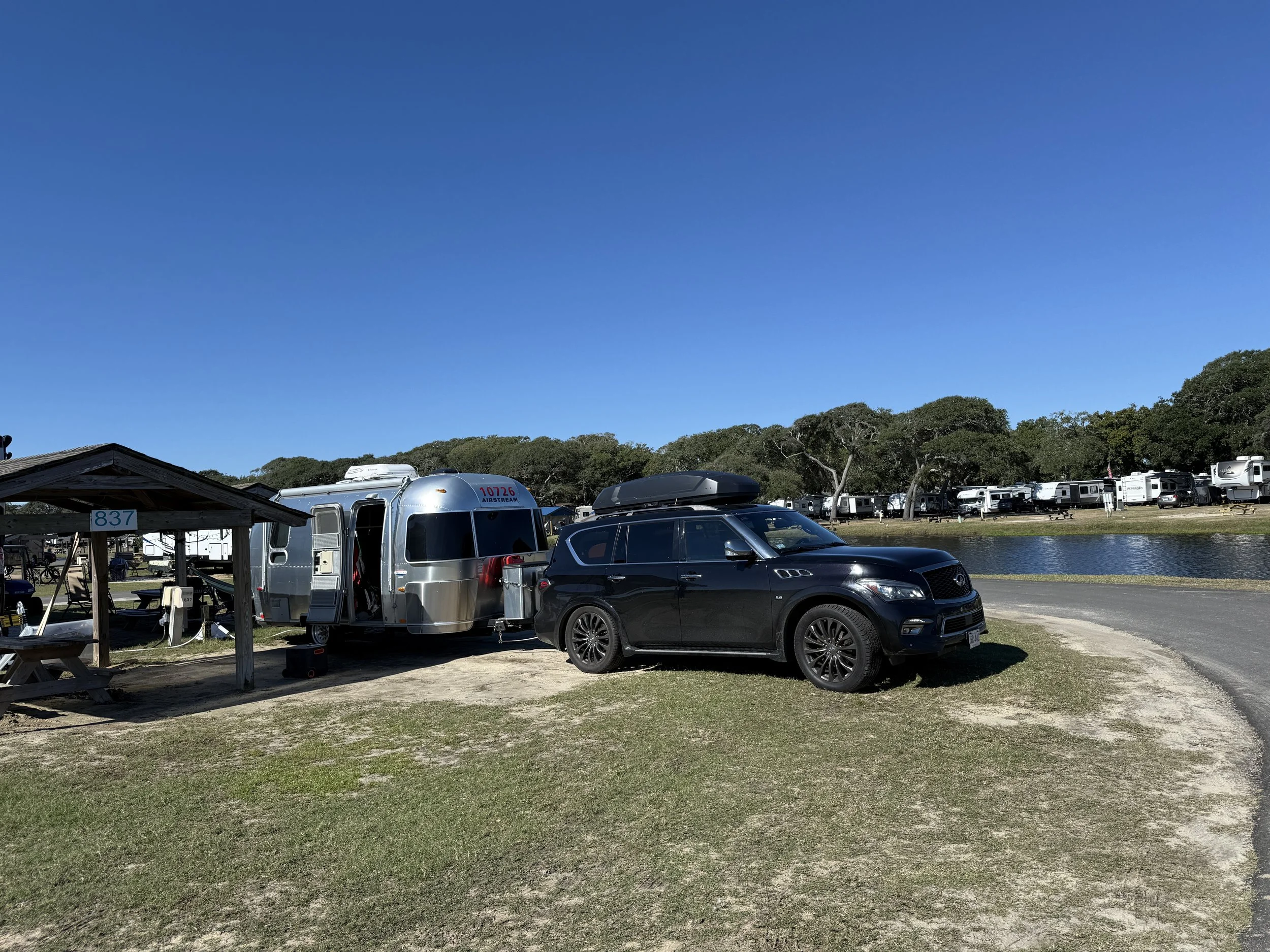 My new winter spot just south of the main drag in Myrtle Beach. I’m in an end lot on a lake and 300’ from the ocean shore. I’ll be enclosing the covered picnic area with industrial grade clear vinyl, and also heat it to give me a all-weather sunroom.